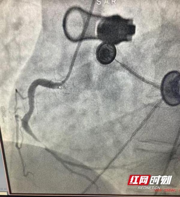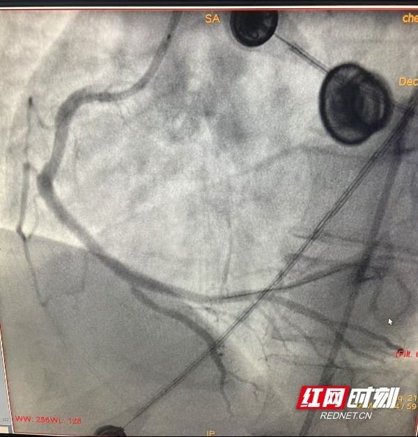 在这生死攸关的紧急时刻,永州市第四人民医院医护团队紧密合作,立即展开现场急救。在稳定患者病情后,迅速将其转运回急诊科。经过复查,完善造影提示大右冠狭窄95%,患者被确诊为急性下壁心肌梗死合并心源性休克。面对紧急情况,医护人员没有片刻迟疑,开启新一轮的抢救工作。心血管、介入科邹主任团队立即启动胸痛患者绿色通道给患者行急诊PCI术,术后血压120/60,心率106次/分,成功脱离危险。